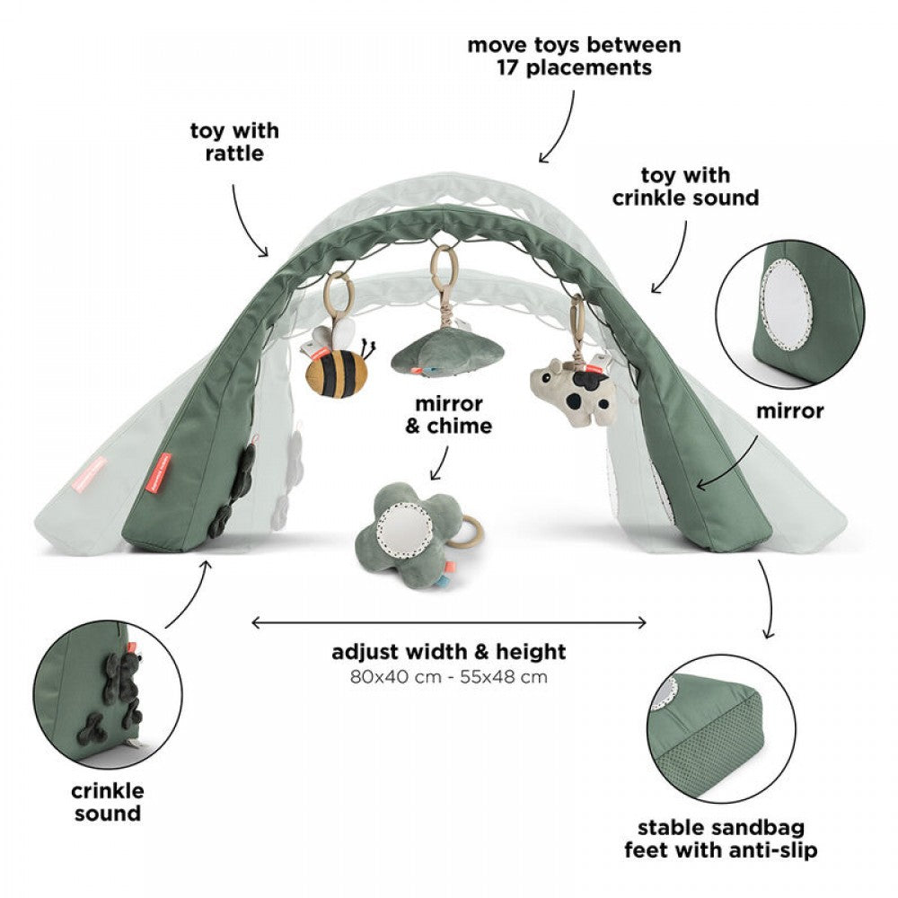 Изданието Tiny Farm в свежо зелено е изпълнено с фермерски забавления и сетивни изненади за вашето мъниче. Позволете на любопитните пръстчета да откриват собственото си отражение, шумолящи звуци, различни текстури и форми, които насърчават опознаването на света чрез игра.