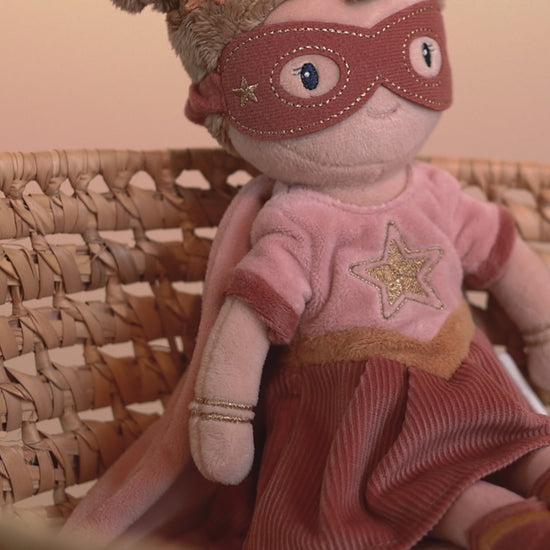 Запознайте се със Superhero Rosa – смела и нежна едновременно! Със своята модерна маска, блестящи златни детайли и мека пелерина, тя е винаги готова за ново приключение.