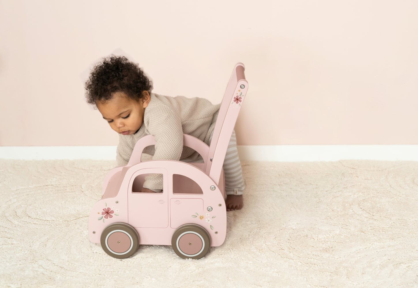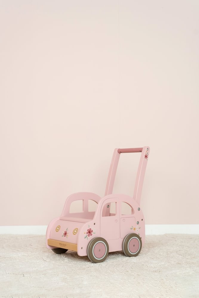Ходи, играй и учи! Впуснете се в приключение из хола с розовата количка за бутане. Стъпка по стъпка ще се научите да ходите, а тази количката ще ви помага по пътя. Дървената розова количка за бутане не е предназначена само за подпомагане на първите стъпки на вашето мъниче, а нейният дизайн служи и като идеална ракла за играчките на вашето дете. Страхотна за развиване на баланс, координация и двигателни умения. А благодарение на гумените ленти около колелата, не е нужно да се тревожите за пода, докато вашето мъниче обикаля из стаята.