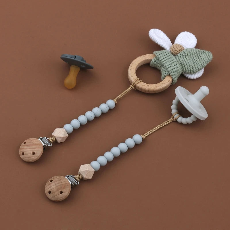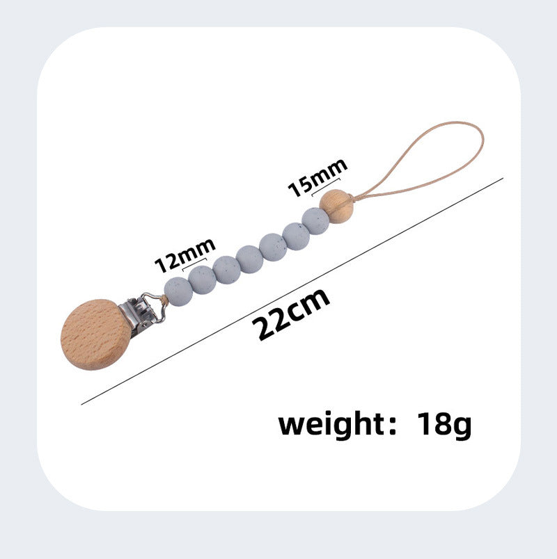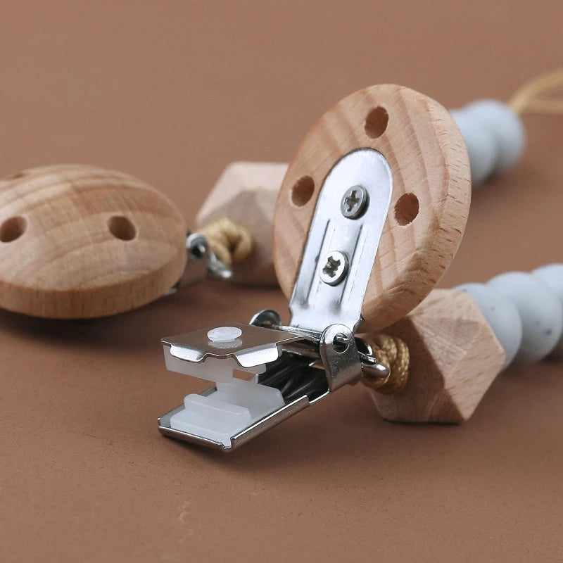 Край на изгубените биберони! За спокойни родители и щастливи бебета! Този очарователен клипс е изработен от безопасни силиконови мъниста и висококачествено дърво, нежни към кожата и венците на бебето. Той е идеалното решение за загубени залъгалки и болки при никнене на зъбки!